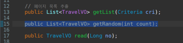 @Override public List<TravelVO> getRandom(int count) { return mapper.getRandom(count); }Controller