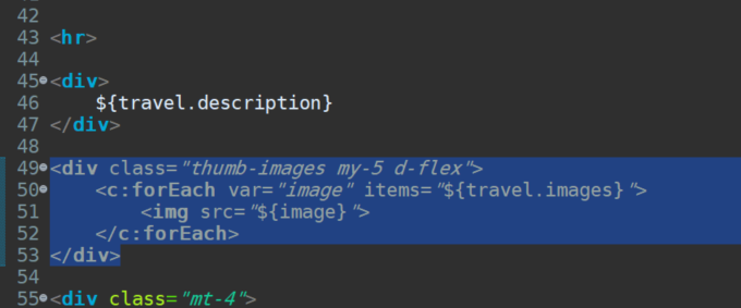 <style> .thumb-images img{ width: 20%; height: 150px; padding: 2px; object-fit: cover; } </style><div class="thumb-images my-5 d-flex"> <c:forEach var="image" items="${travel.images}"> <img src="${image}"> </c:forEach> </div>